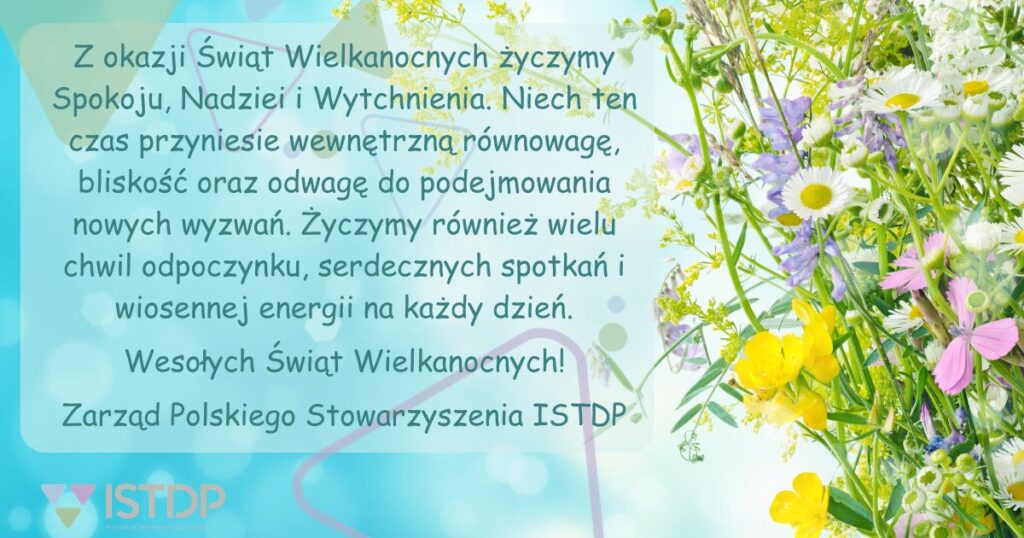 Z okazji Świąt Wielkanocnych życzymy Spokoju, Nadziei i Wytchnienia. Niech ten czas przyniesie wewnętrzną równowagę, bliskość oraz odwagę do podejmowania nowych wyzwań. Życzymy również wielu chwil odpoczynku, serdecznych spotkań i wiosennej energii na każdy dzień. Wesołych Świąt Wielkanocnych! Zarząd Polskiego Stowarzyszenia ISTDP